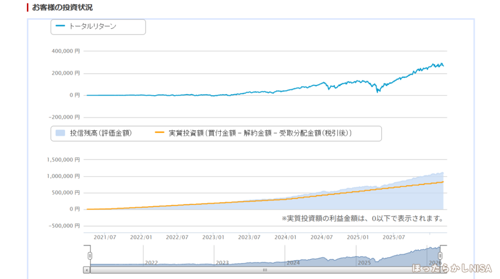 自分も運用中に何度か市場が下がるタイミングがありましたが、少額だったおかげで焦らず冷静に放置できました(笑)。