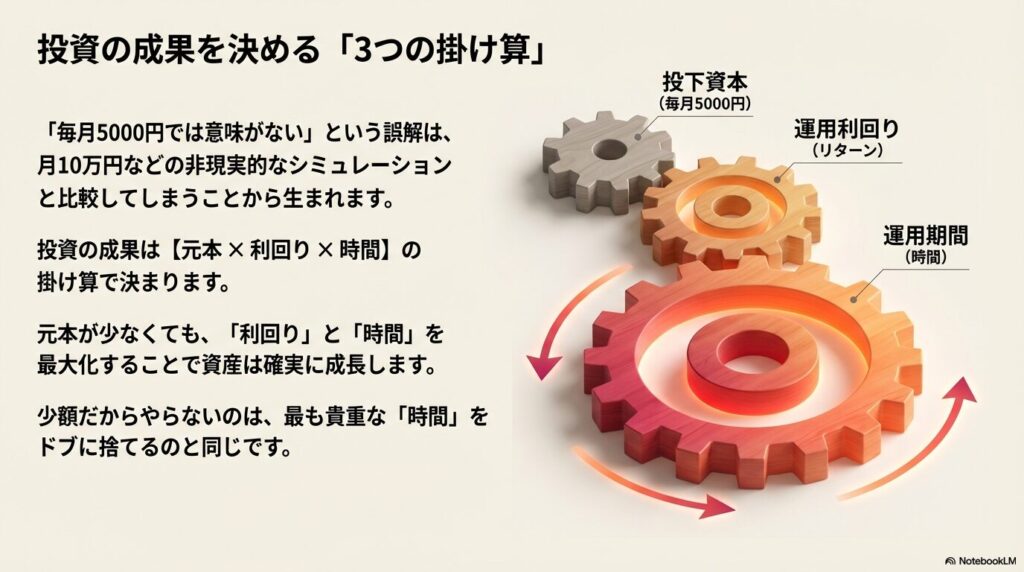 よくメディアなどでは「毎月10万円を投資した場合」のようなダイナミックなシミュレーションが紹介されるため、月5000円がちっぽけに見えてしまうことがあります。これが「意味ない」という誤解を生む原因です。