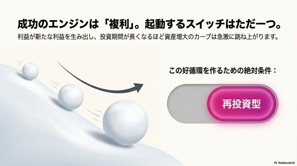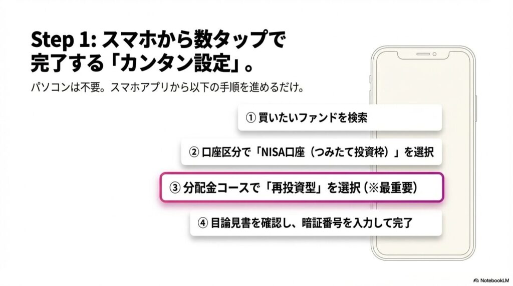 ここで一番重要なのは、分配金コースで「再投資型」を選ぶことです。この設定さえ済ませておけば、あとはほったらかしで毎月自動的に資産が積み上がっていきます。