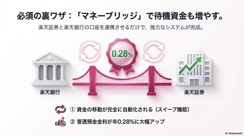 まずは少額からでも構いませんので、証券口座と楽天銀行のマネーブリッジを設定し、優良なインデックスファンドの積立設定を完了させてみてください。