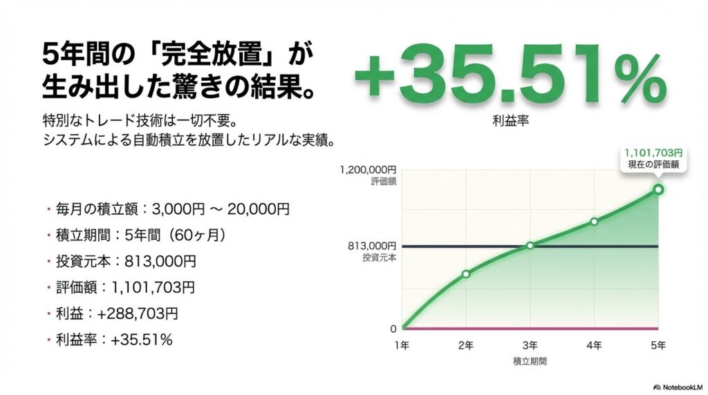 投資元本813,000円に対して、特別なトレード技術などは一切使わず、ただひたすらにシステムによる自動積立を放置していただけ・・・