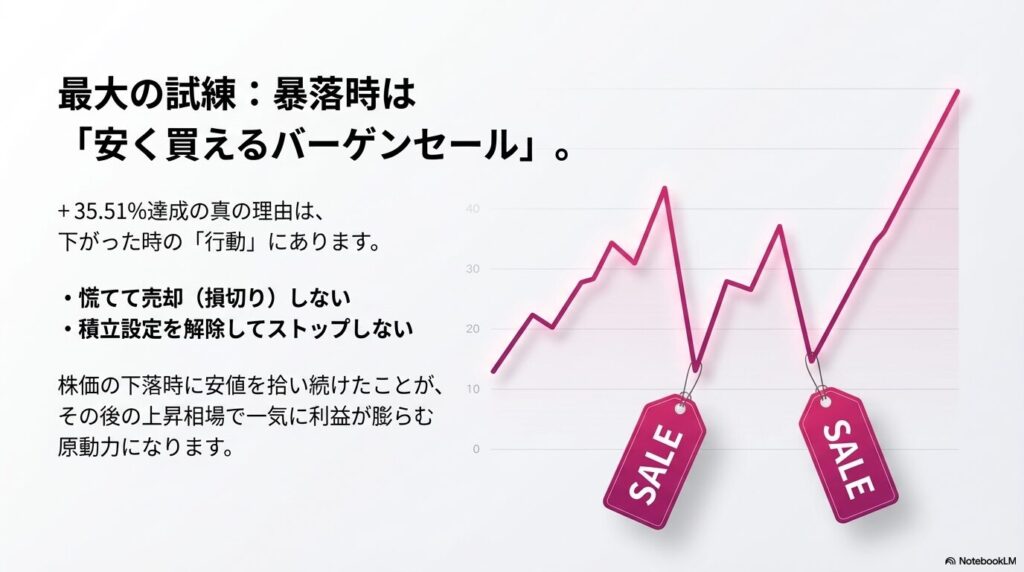 ここで紹介しているプラス35.51%という利益や数値データは、あくまで自分の特定の期間における運用実績(目安)です。将来の運用成果を保証するものではありません。