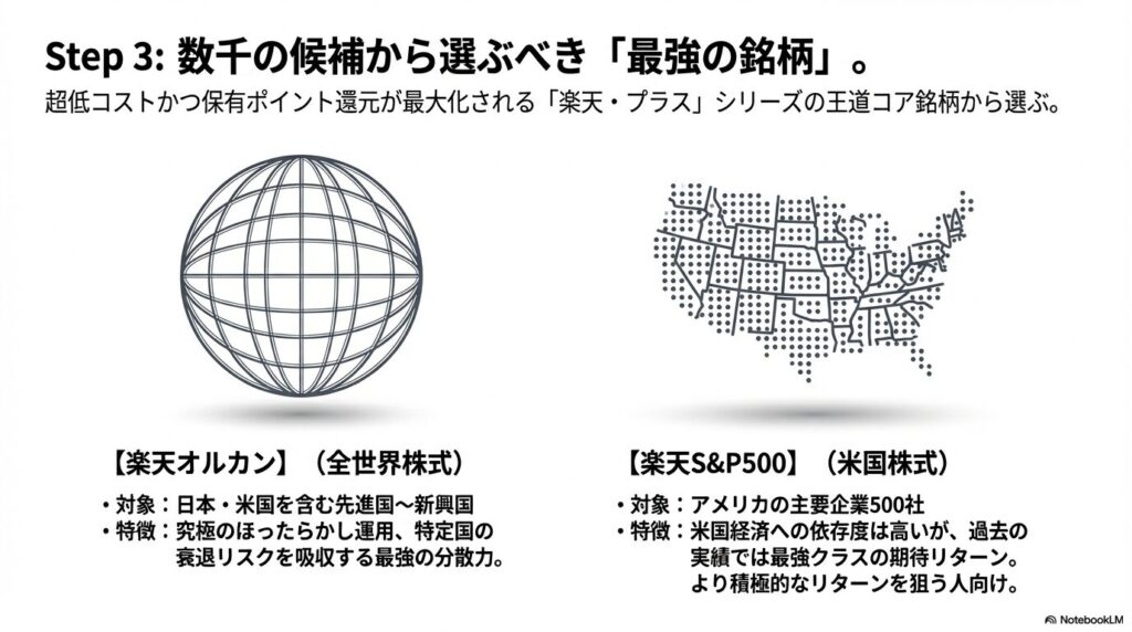 楽天証券には数千本という投資信託が用意されていますが、長期的な資産形成において選ぶべきファンドはごく少数に限られます。