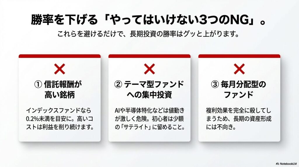 ファンドを選ぶ際に、初心者が陥りがちな罠やデメリットについても事前に把握しておきましょう。