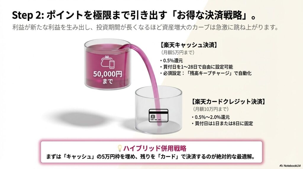 積立額に応じて楽天キャッシュ(月5万まで)と楽天カード(月10万まで)を併用し、ポイント還元を最大化する。